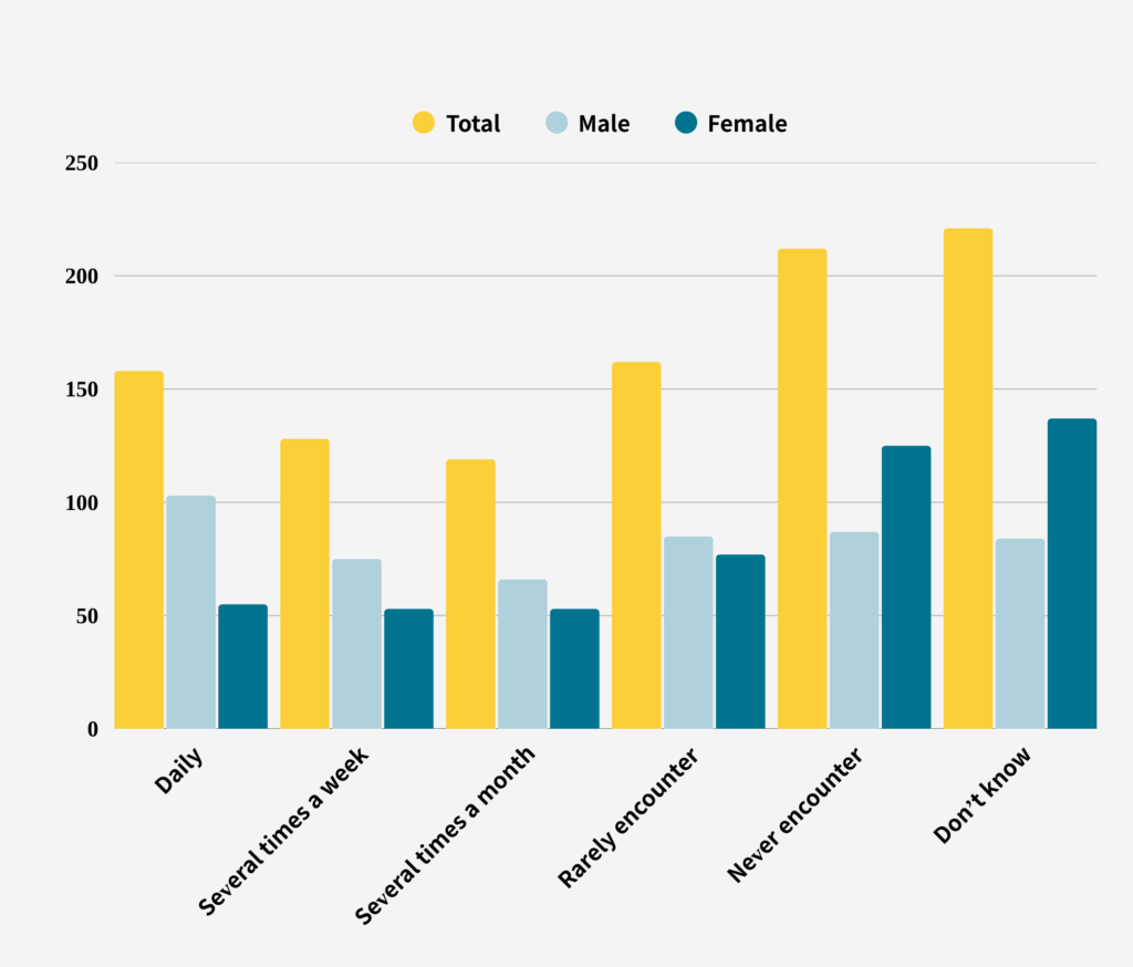 Our data shows that men report daily contact with overseas brands more than women (approximately 11.6% vs. 6.6%), and women are more likely to never interact with those brands (about 34.8% vs. 28.4%). For domestic brands, men are much more likely to have daily contact (around 20.6% vs. 11%) and less likely to never interact (about 17.4% vs. 25%). Additionally, women have higher rates of uncertainty (“unknown”) for both overseas (about 23.2% vs. 16.2%) and domestic (approximately 27.4% vs. 16.8%) brands.