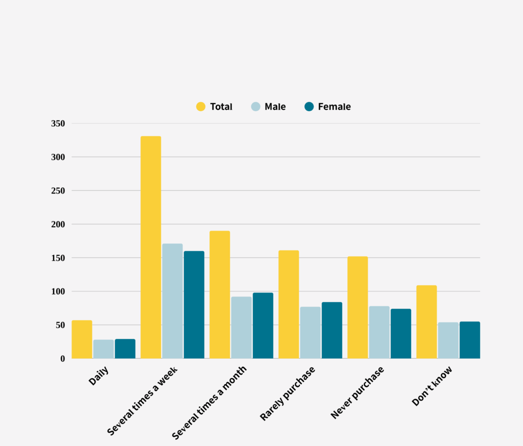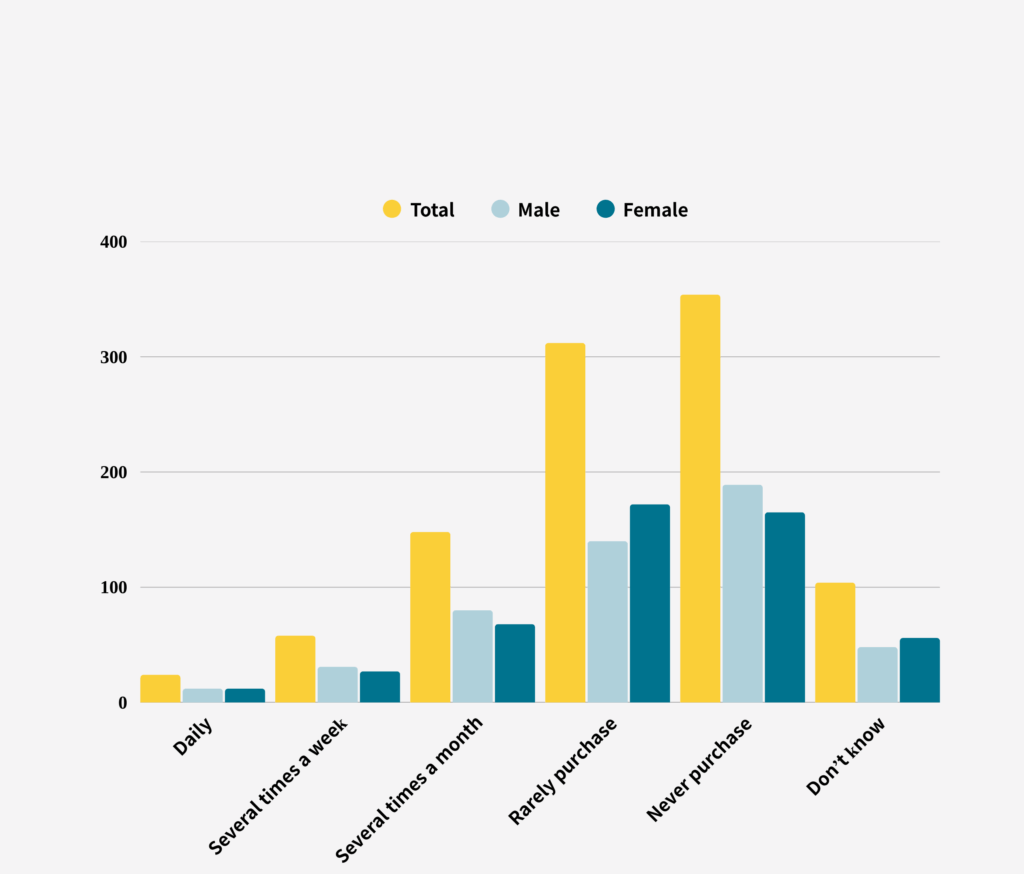 Our data shows that women are more likely than men to report that they almost never buy overseas brands (34.4% vs. 28%), indicating a slightly lower engagement level. Conversely, men are somewhat more likely to say they never purchase at all (37.8% vs. 33%). In categories such as daily, weekly, and monthly purchases, the proportions between men and women are nearly identical, reflecting no meaningful gender gap. Additionally, the share of respondents uncertain about their purchase habits is similar for both genders. These patterns imply that while overall interest in overseas brands is low, women tend to engage even less than men.