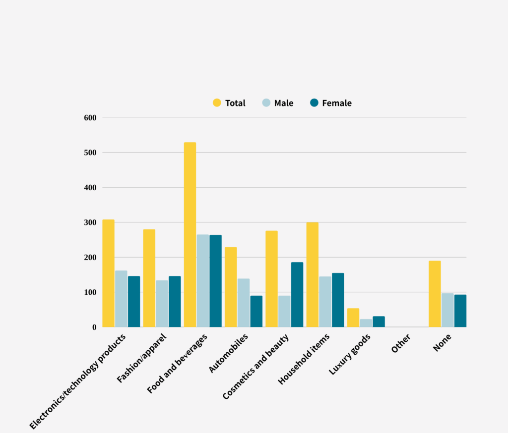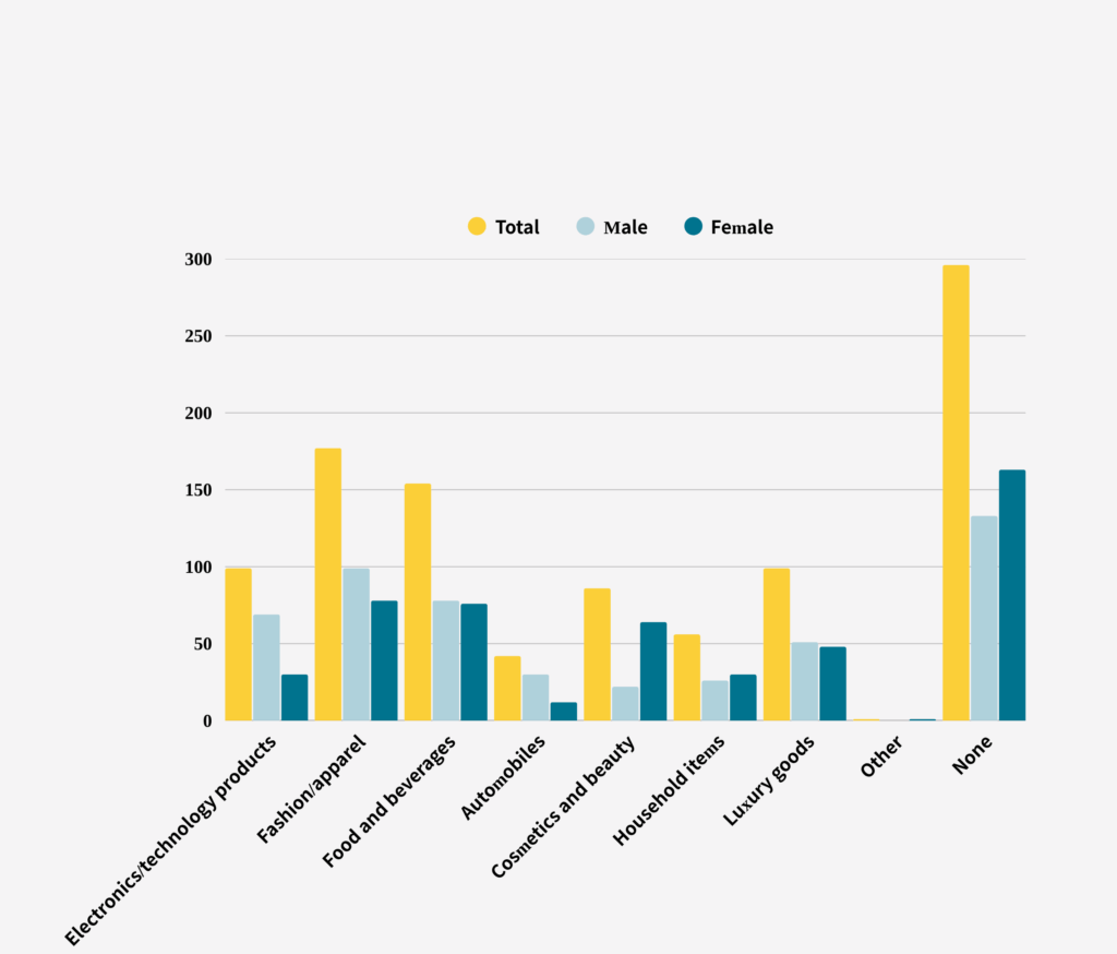 Our data shows that men are significantly more likely than women to prefer overseas electronics (about 22% vs. 9%), fashion items (32% vs. 23%), and automobiles (10% vs. 4%). Conversely, women show a much stronger preference for cosmetics and beauty products (19% vs. 7%). Additionally, a higher share of women report no preferred overseas category (49% vs. 43%).