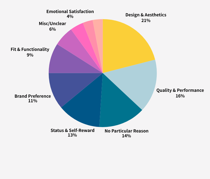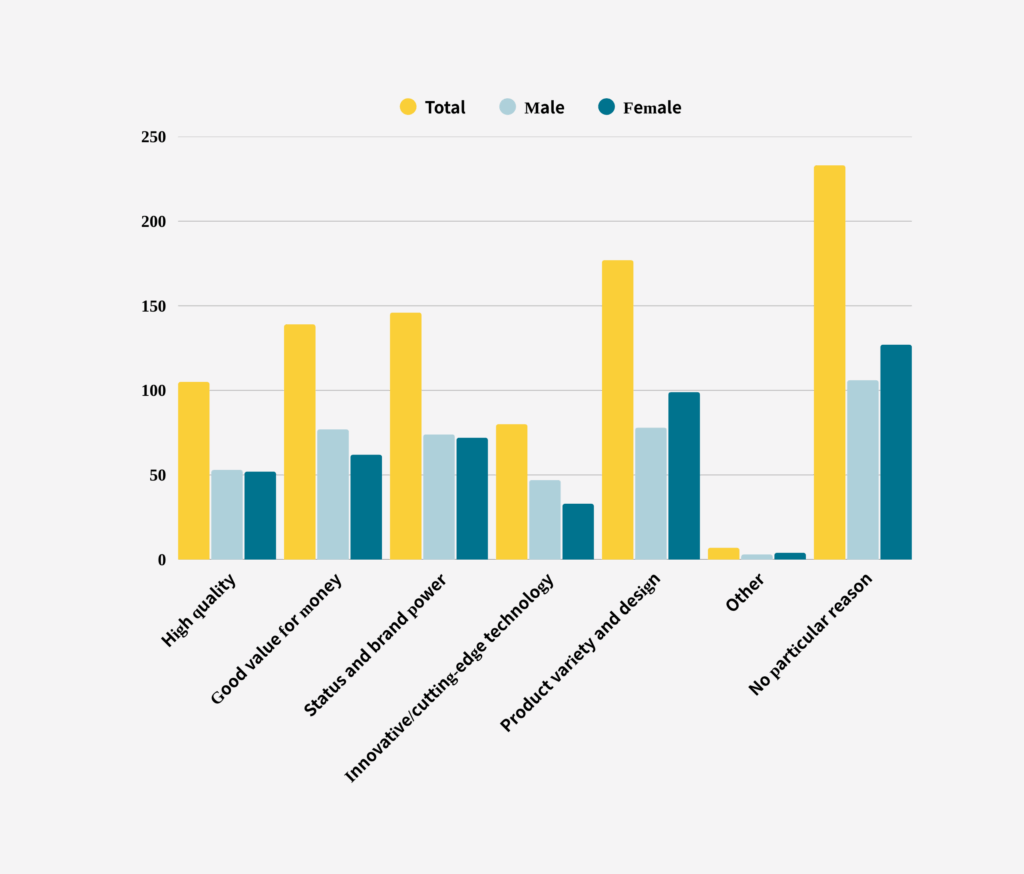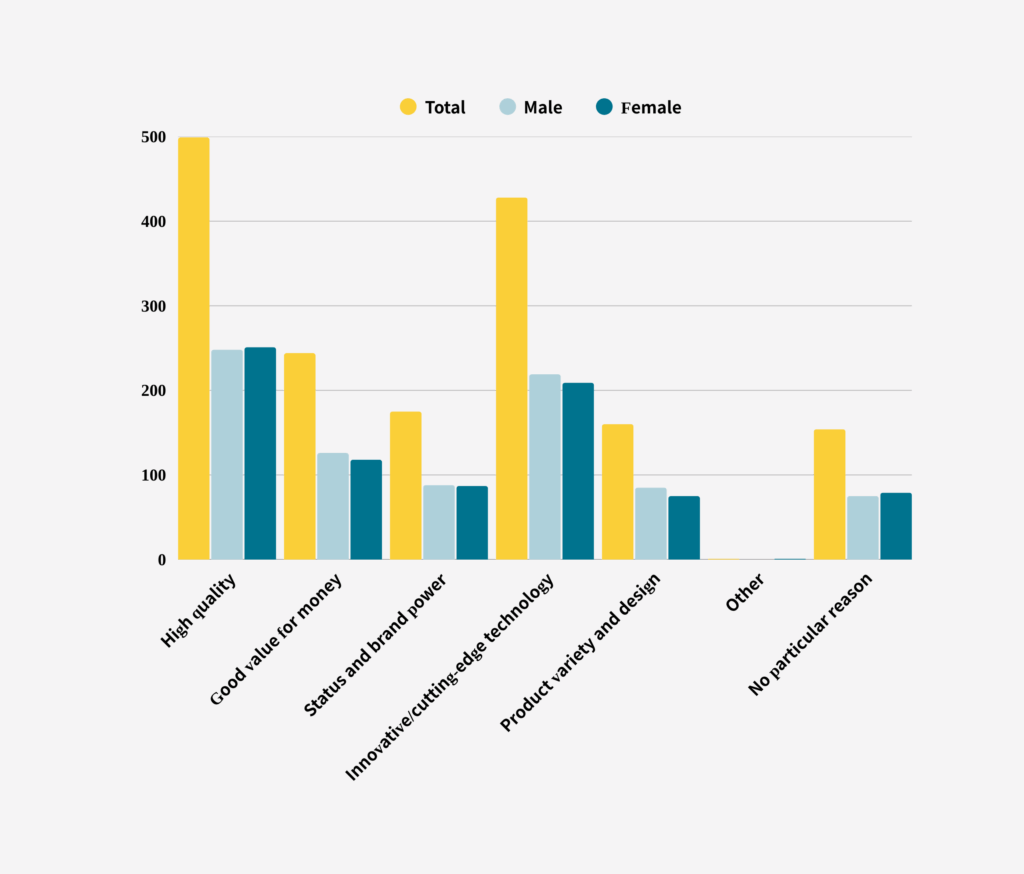 Our data shows that men are notably more driven by cost performance (approximately 25% of men vs. 19% of women) and cutting-edge innovation (around 15% vs. 10%), whereas women’s reasons align more closely with the general trends without these emphases.