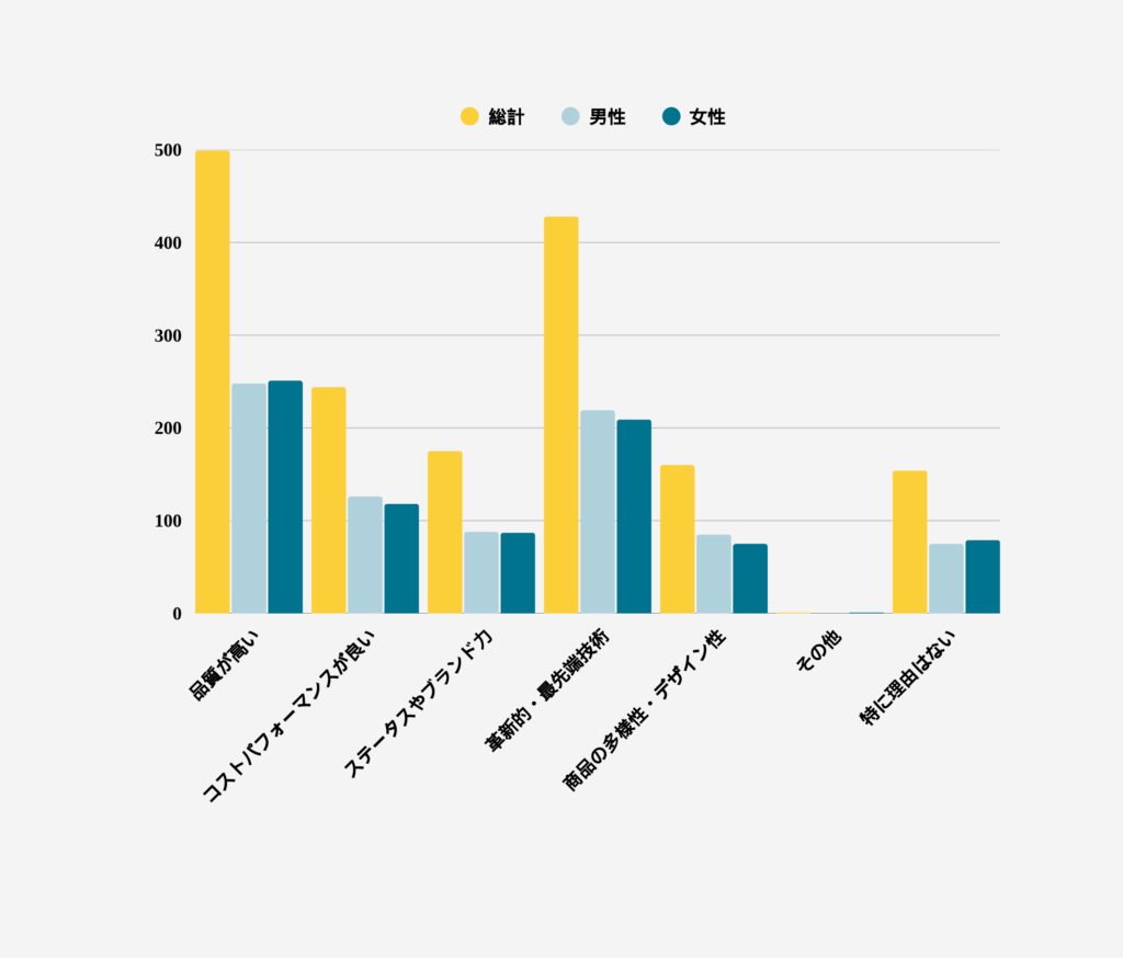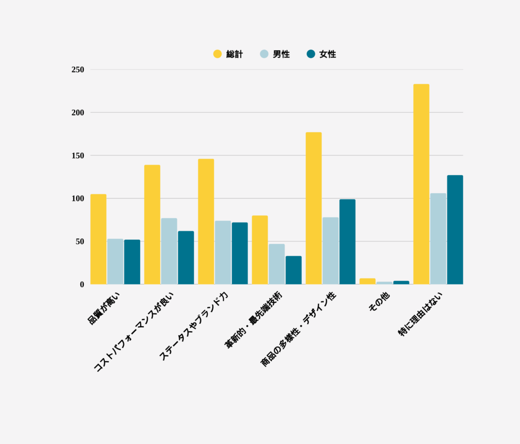 この結果から、男性がコスパ(男性約25% 対 女性約19%)や革新的・最先端技術(約15% 対 約10%)をより重視しているのに対し、女性はこれらの理由をそれほど強く挙げておらず、他の理由と同様の傾向を示していることが分かります。