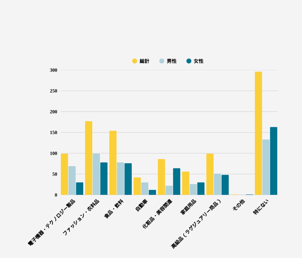 結果は、男性が女性よりも海外ブランドの電子機器(約22%対9%)、ファッションアイテム(約32%対23%)、自動車(約10%対4%)を好む傾向が強いことを示しています。逆に、女性は化粧品・美容関連をより好み(約19%対7%)、さらに女性の方が海外ブランドの好みがないと回答する割合も高く(49%対43%)なっています。