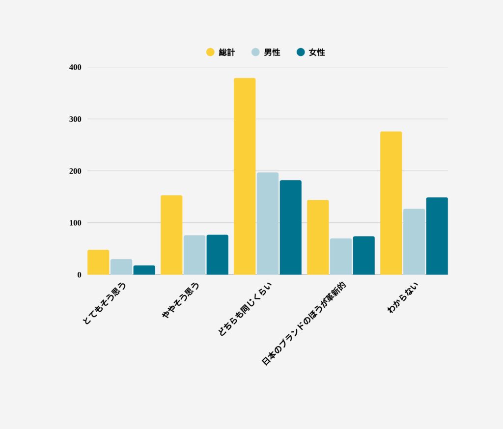 海外ブランドがより革新的だと考えるのは約20%で、多くは両者を同程度(約38%)と見なし、約28%がわからないと答えています。全体として、海外ブランド優位の評価は少数派です。